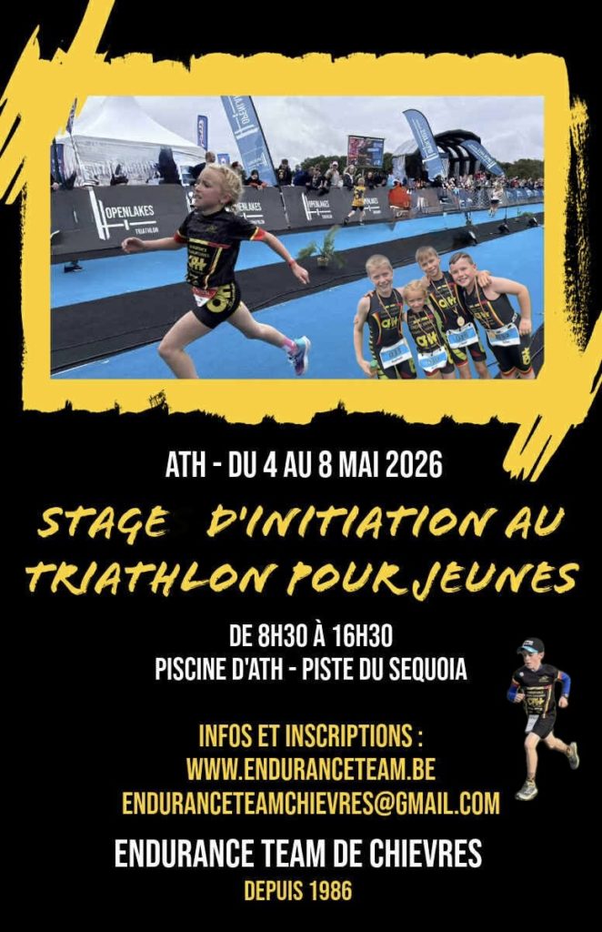 L’Endurance Team Chièvres organisera un stage d’initiation au Triathlon durant le congé de Printemps du 4 mai au 8 mai 2026.